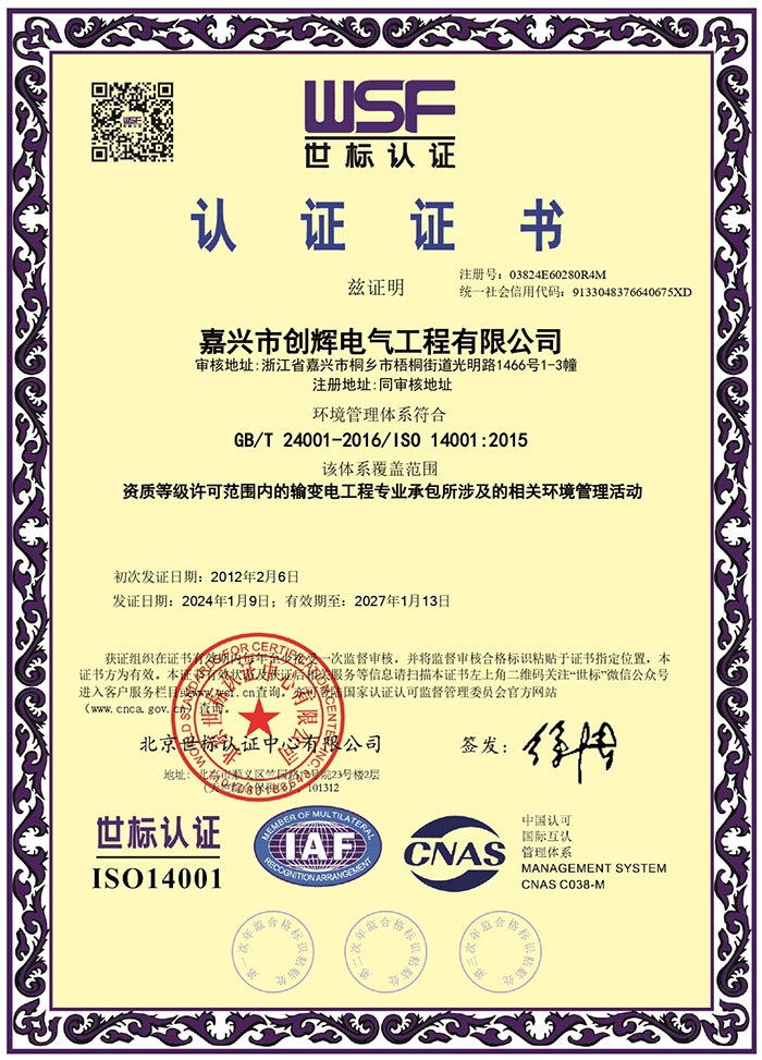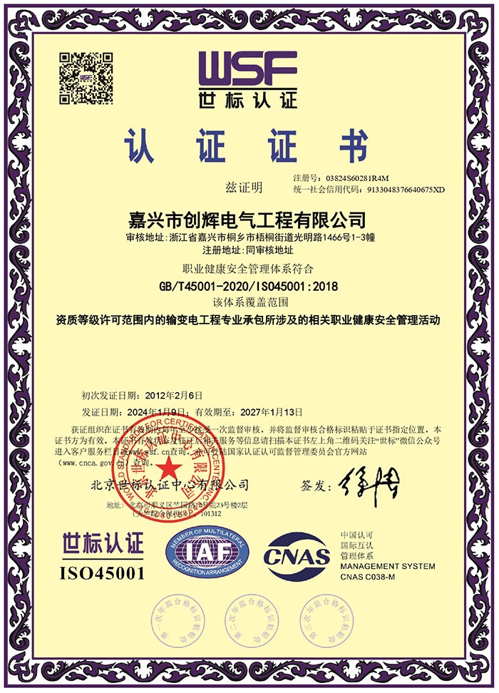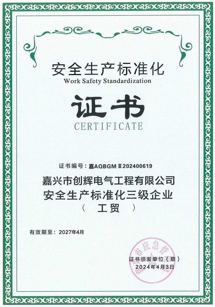 嘉興市創(chuàng)輝電氣工程有限公司,總部坐落于浙江桐鄉(xiāng)經(jīng)濟(jì)開發(fā)區(qū),公司成立于2004年,是一家承接高、低壓輸變電工程施工安裝、維修的企業(yè)。公司下設(shè)人事行政部、預(yù)結(jié)算部、采購(gòu)部、財(cái)務(wù)部、營(yíng)銷部和工程部等,其中工程部根據(jù)具體作業(yè)內(nèi)容分設(shè):變電項(xiàng)目部(12個(gè)班組)、線路項(xiàng)目部(6個(gè)班組)?,F(xiàn)有員工500余人,其中擁有一級(jí)建造師3名,二級(jí)建造師15名,高級(jí)工程師1名,工程師36名,助理工程師52名,高壓電工240余名。目前我公司已具備電力工程總承包貳級(jí)資質(zhì),輸變電工程專業(yè)承包貳級(jí)資質(zhì),城市及道路照明工程專業(yè)承包貳級(jí)資質(zhì),承裝(修、試)電力設(shè)施許可二級(jí)資質(zhì),建筑施工安全生產(chǎn)許可,是浙江省高新技術(shù)企業(yè)、省AAA級(jí)“守合同重信用”企業(yè)。